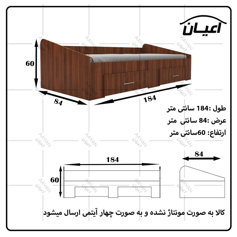 تخت خواب نوجوان -جنس مغزی نئوپان با روکش ملامینه شرکتی-کالا فاقد تشک می باشد - سایز تشک مناسب 80x180سانت است - کالا به صورت مونتاژ نشده(جدا از هم) ال می شود - دارای دو عدد کشوی چرخدار که قابل جابجایی است- بسته بندی کالا به صورت چهار آیتمی است - جنس کفی تخت نئوپان به صورت دو تکه است - رنگ بندی کالا در آلبوم قابل مشاهده است(در رنگ های سفید/مشکی/قهوه ای/قهوه ای روشن/قهوه ای تیره (ونگه)/گردویی/طوسی و چند رنگ(سفید و طوسی) تولید می شود)-تنها در صورتی کالای انتخابی مطابق با تصاویر و مشخصات درج شده خواهد بود که هنگام انتخاب، فروشنده رسمی برند که با تیک آبی مشخص شده است را انتخاب نمایید. هنگام خرید و دریافت کالا به بسته بندی و لوگوی برند دقت فرمایید.