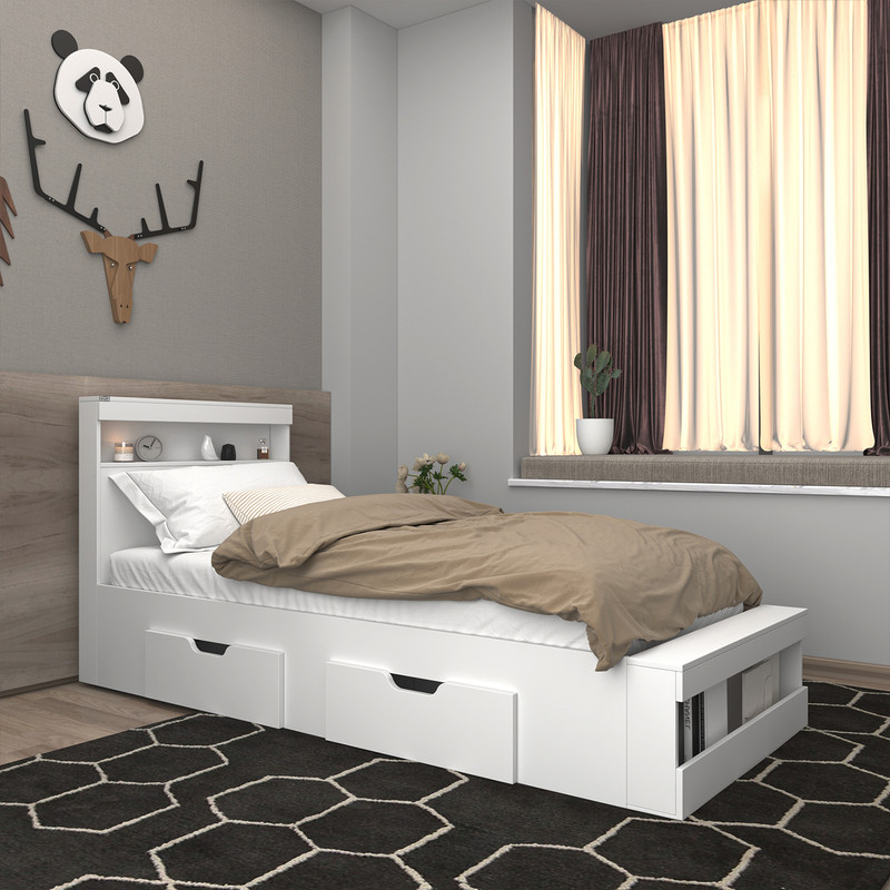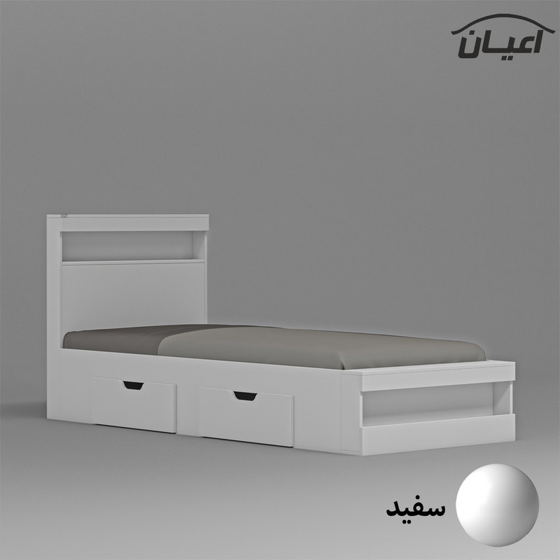 تخت خواب نوجوان -جنس مغزی نئوپان با روکش ملامینه شرکتی-کالا دارای یک باکس در قسمت کلگی بالا و یک باکس قسمت کلگی پایین است-دارای دو کشو چرخدار-کشو ها امکان جابجایی به طرفین را دارد-دستگیره کشو ها به صورت سی ان سی منحنی می باشد-کالا فاقد تشک می باشد-جنس کفی کالا نئوپان خام است-کالا به صورت مونتاژ نشده و در بسته بندی 5آیتمی ال می شود-رنگبندی کالا:سفید/مشکی/قهوه ای(گردویی)/قهوه ای روشن/قهوه ای تیره/طوسی/چند رنگ(مشکی-سفید)-رنگ بندی کالا در آلبوم قابل مشاهده است.