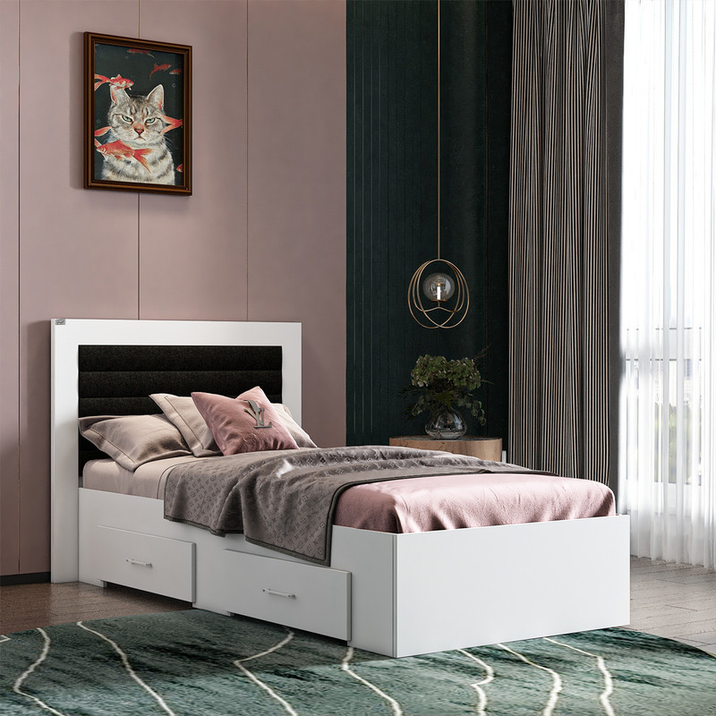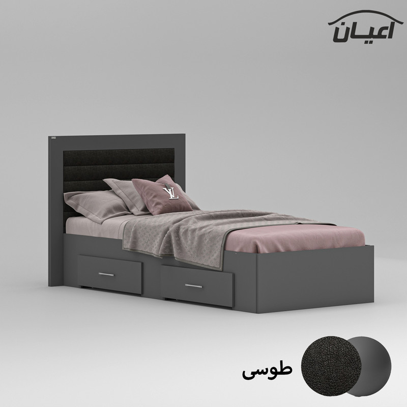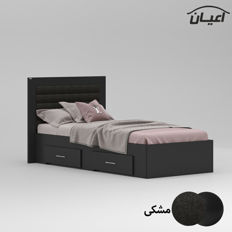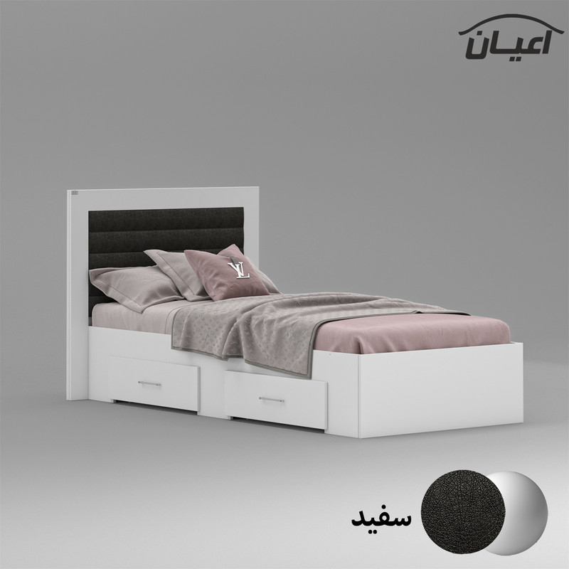 تخت خواب یک نفره ، جنس نئوپان با روکش ملامینه، طراحی ساده، شیک و ترکیب با لمسه چرم مصنوعی مشکی، دارای دو کشو با چرخ چمدانی (ساکی) ، کشوها قابل جابجایی در طرفین هستند ، ال به صورت مونتاژ نشده صورت می گیرد، کالا فاقد تشک می باشد، کفی به صورت دو تکه به همراه چند جفت پایه متحرک است، سایز تشک مناسب برای تخت خواب(200×90 سانتی متر) می باشد ، این کالا با رنگ بندی (سفید ، طوسی ، مشکی ، قهوه ای روشن ، قهوه ای (گردویی) ، قهوه ای تیره (ونگه) ) تولید و عرضه می شود ، این کالا را فقط با لوگو و برند تهیه کنید، لطفا توجه داشته باشید که همواره چند درجه اختلاف رنگ بین تصاویر بارگذاری شده و کالای ساخته شده وجود دارد.