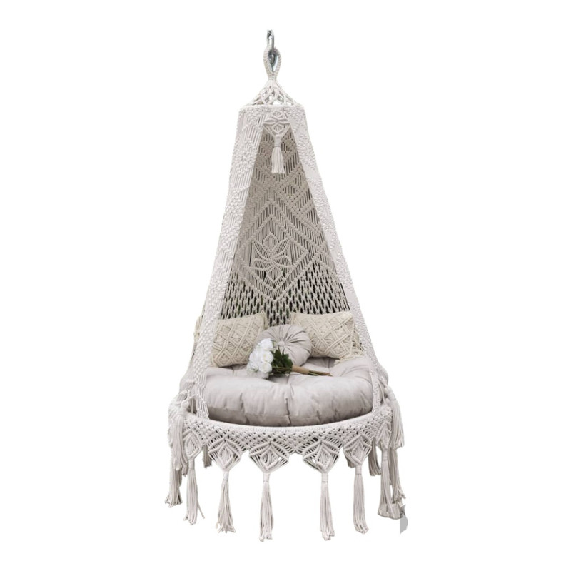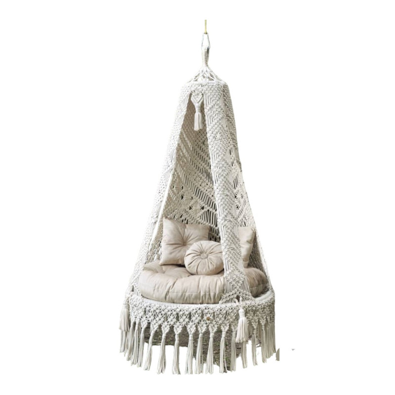 تاب مکرومه ، با قطر 100 ، بهترین دلیل برای آرامش روح و روان ، این تاب بافته شده با نخ پلی استر مغزدار که مخصوص مکرومه بافی هست بافته شده ، اینکار با کارهای بازاری و بافته شده با نخ پنبه اصلا قابل ق نیست ، جنس تشک مازراتی درجه یک صادراتی میباشد ، الیاف پر شده داخل تشک از الیاف درجه یک جهان آسا میباشد . چهار عدد زنجیر جهت استحکام کار و سیم بکسل مخصوص مکرومه جهت محکم کاری و استقامت تاب میباشد ، تحمل وزن تا 130 کیلو ، ارتفاع تاب 235 میباشد ، لطفا توجه بفرمایید که رنگ بندی مخصوص رنگ تشک میباشد نه بافت تاب ،