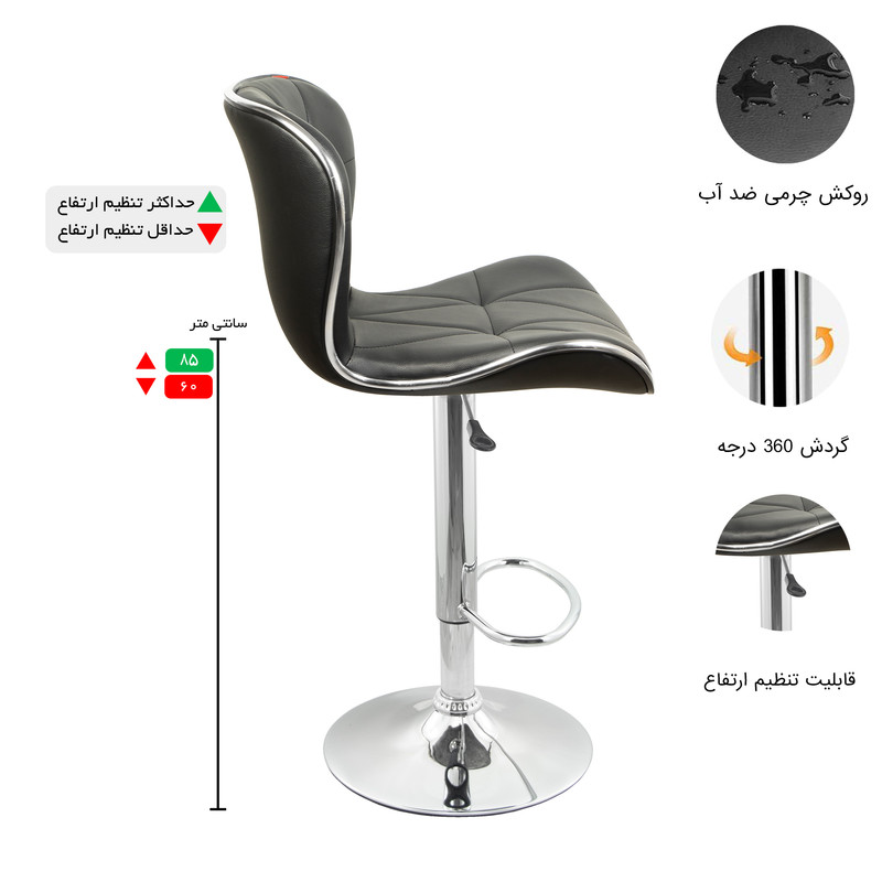 مدل BH820Z با کلاف چوبی و با روکش چرمیطراحی و تولید شده است. با گردش 360 درجه قابلیت استفاده بهینه در فضاهای کوچک اداری، خانگی و رستورانی را دارا است. استفاده از روکش چرم PVC مقاوم دربرابر سایش و اشعه ماوراء بنفش از ویژگیهای بارز این محصول به شمار میرود که با تنوع بیش از بیست رنگ قابلیت تولید و تحویل را دارا است. ارتفاع جک 27 سانتی متری امکان تنظیم محصول در ارتفاعهای مختلف را برای کاربران میسر مینماید. پوشش سطوح فلزی از مواد بسیار مقاوم نیکل کروم بوده که امکان بهره ورداری از محصول را در شرایط مختلف آب و هوایی میسر میسازد. این محصول به گونه ای طراحی شده است که ارگونومی بوده و راحتی بسیار مناسبی را نسبت به سایر محصولات گروه کانتر(اپن) دارا است.لطفا در هنگام خرید و دریافت این کالا به نام و برند بر روی محصولات توجه فرمایید.