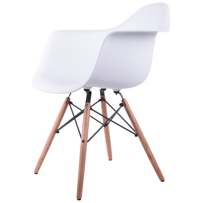 «صندلی دسته دار کتیک مدل White Armchair Wood Legs» یک صندلی با طراحی زیبا و راحت است. نشیمن و دسته صندلی بصورت یکپارچه آن از پلی پروپیلن و پایه ها از چوب طبیعی ساخته شدهاند. پایه های چوبی این صندلی با قطعات کوچک فلزی، شبیه برج ایفل بهم متصل شده و استحکام مطلوبی به صندلی داده اند. این نوع صندلی سبک و راحت، برای میزناهارخوری، میز کار، کانتر و همچنین در پاسیو قابل استفاده است. در قسمت انتهایی هر یک از پایه های صندلی از واشرهای پلاستیکی استفاده شده تا علاوه بر آسیب نرساندن به کف، رطوبت و خیسی کف نیز به پایه های چوبی صندلی، نفوذ نکند. این صندلی زیبا، بصورت دو تکه شامل «چهارپایه» و «نشیمن»، بسته بندی و تحویل داده میشود. شما میتوانید به آسانی، این دو بخش را با پیچ متصل کنید. همراه صندلی 4 عدد پیچ، آچار و دفترچه راهنما آمده است و فقط کافیست نشیمن را با چهار عدد پیچ به پایه ها وصل کنید. فضای کمی را اشغال میکند و زیبایی خاصی به دکوراسیون شما میدهد. ترکیب این صندلی با میز ناهارخوری مدرن و اسپرت، طرفداران بسیاری دارد.