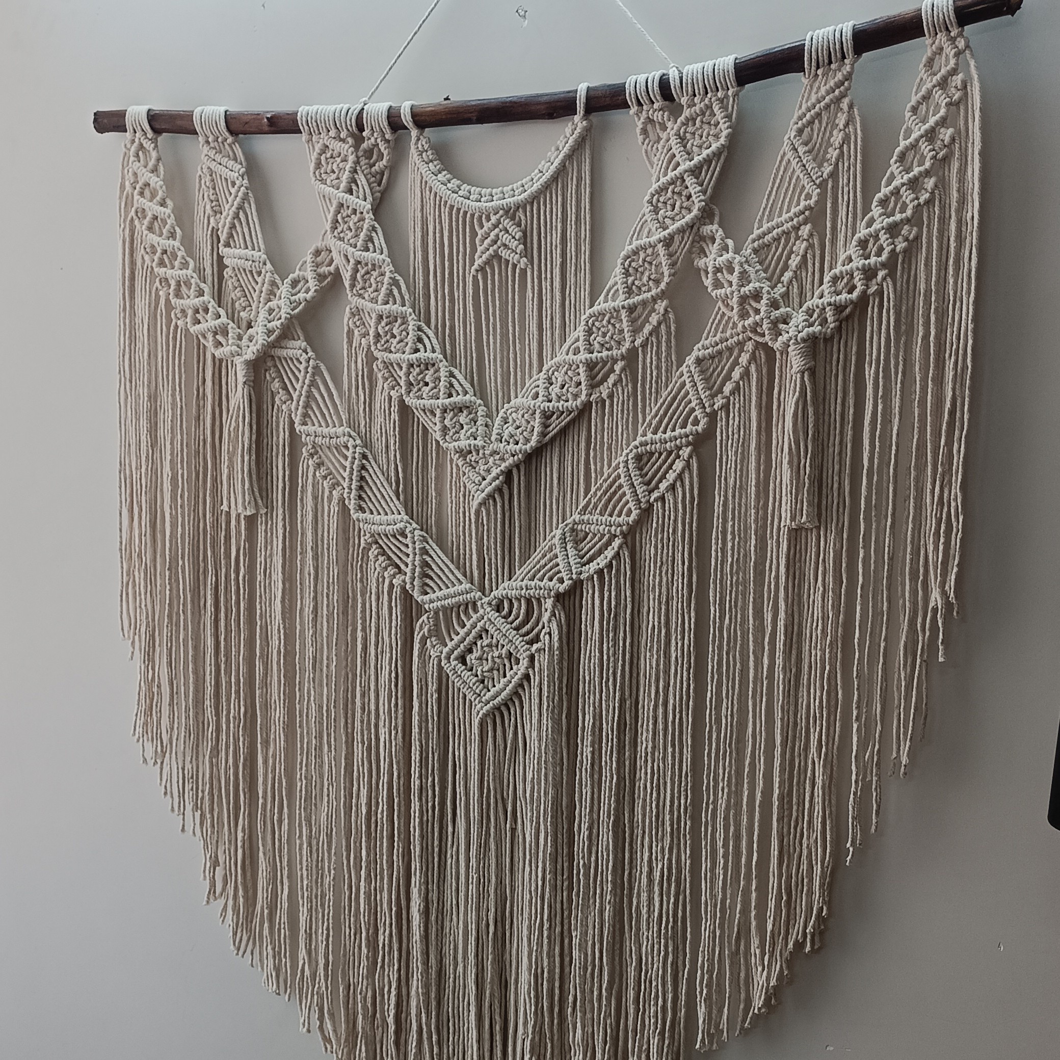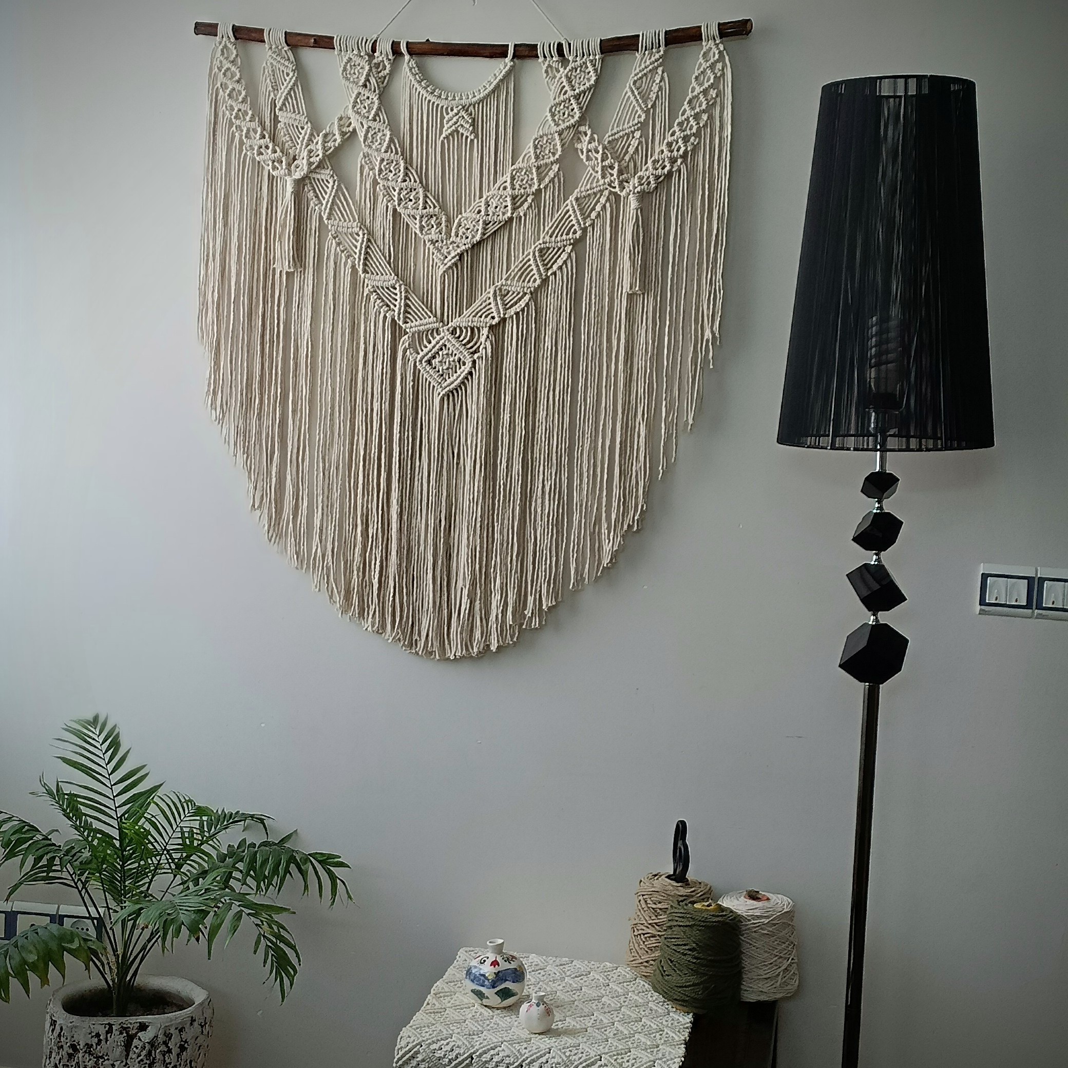 دیوارکوب مکرومه سایز بزرگ و زیبا به رنگ شیری در ابعاد طول چوب یک متر و ارتفاع یک متر و سی سانت خانمان مدل 366838