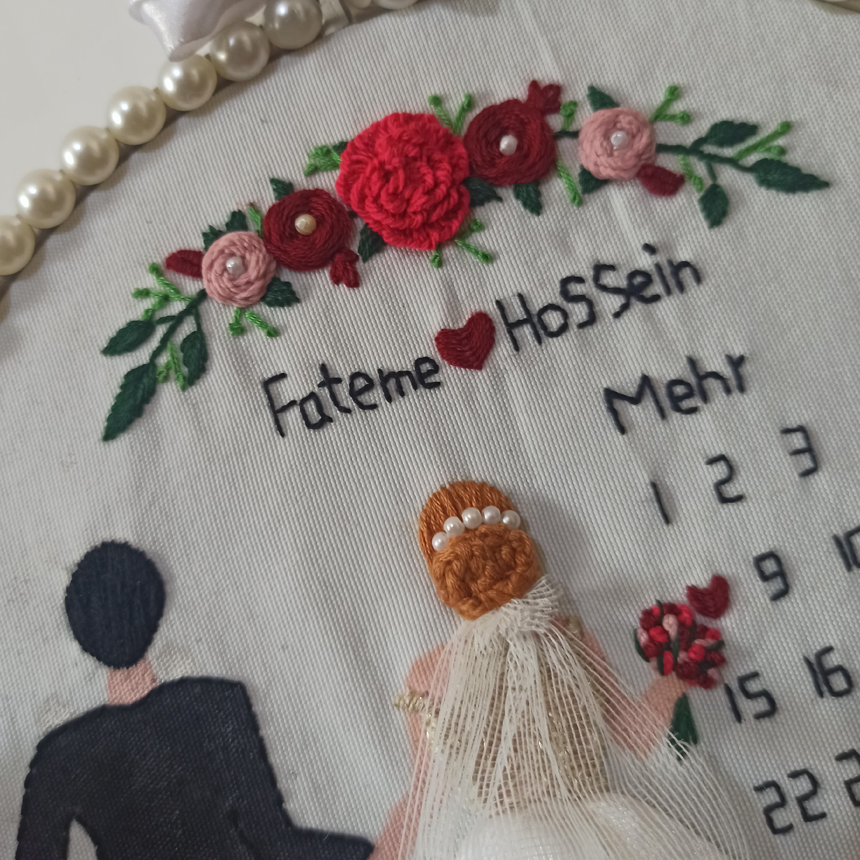 دیوار کوب سالگرد ازدواج تقویم سالگرد ازدواج گلدوزی شده با دست دیوارکوب عروس داماد خانمان مدل 366894